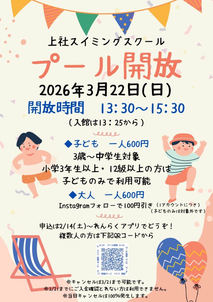 3月22日(日)は、13:30~15:30の時間でプールを特別開放します☆